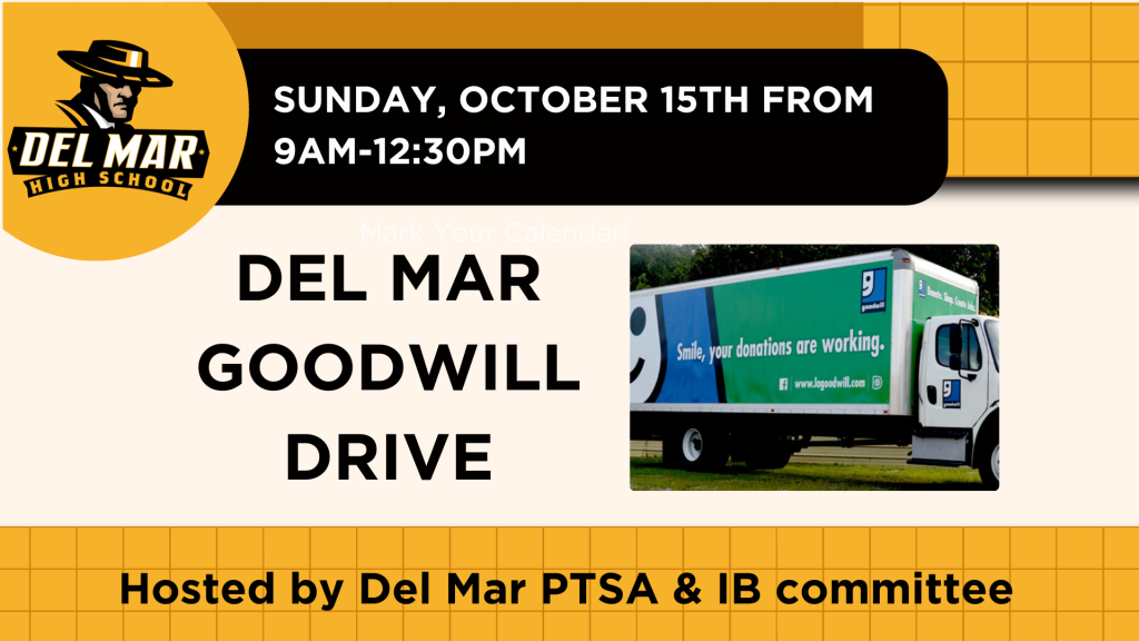 Clean out your closets and your home before the holidays and support the Del Mar IB Program! On Sunday October 15th from 9:00am-12:30pm, Del Mar’s PTSA & IB committee will be hosting a donation drive! This is the perfect time to drop off your donations to the Goodwill truck before or after service in the front parking lot.